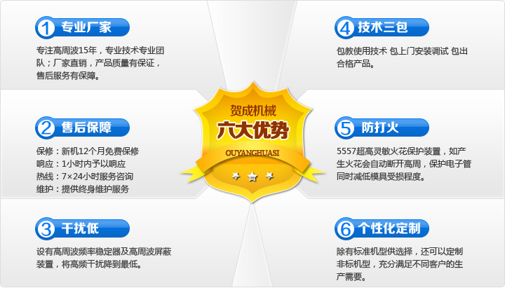 賀成機械專業生產高周波設備、精制高周波模具、供應高周波配件和耗材、提供高周波維修、高周波加工及高周波出租服務。專注高周波15年,為廣大高周波用戶提供一站式采購、服務平臺。